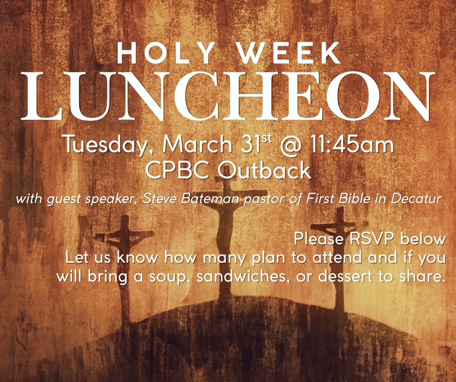 We invite you to join us for our Holy Week Luncheon that will take place on Tuesday, March 31st, at 11:45 AM, in the Outback. This year's guest speaker will be Steve Bateman from First Bible Church. The Lunch will be soup and sandwiches, please make sure to register in advance so we can prepare accordingly. We look forward to seeing you there.